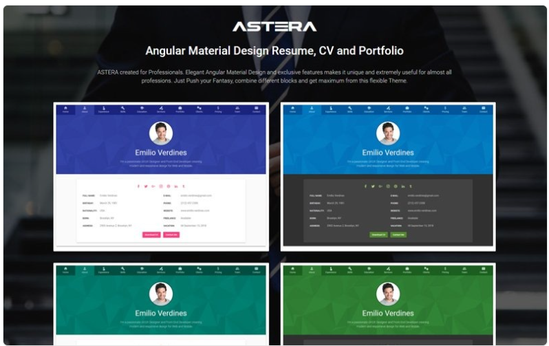 Astera - Resume, CV and Portfolio Angular Material Design Website Template Template is an elegant ready to use website template that you can use to set up your own unique online platform in a short amount of time. No need to learn the details about HTML and CSS coding, simply just download this theme, customize it as per your preference and you should be good to go.