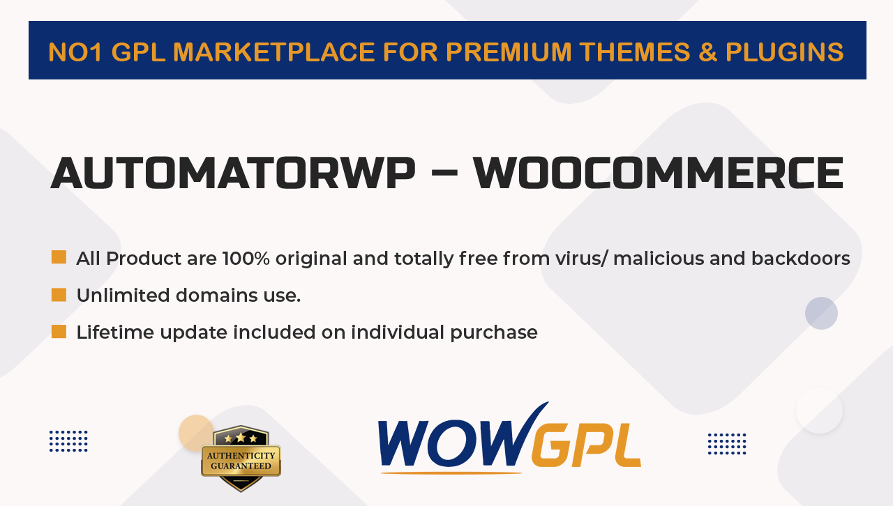 - Better Website Security: AutomatorWP – WooCommerce is a 100% original product that is purchased by Wowgpl under the terms of GPL license. The credit is to the developers. This plugin offers your website better security and virus threat management