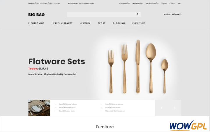 You can get Big Bag - Wholesale Store Modern OpenCart Template here on a huge discount on individual purchase, If you buy Wowgpl membership then You can free download Big Bag - Wholesale Store Modern OpenCart Template as well as You will get access to all the products (32790) free like WordPress, Woocommerce, Joomla, Drupal, Magento, Muse, Opencart, Prestashop, Shopify, Unbounce, Ghost, Tumblr, Virtuemart, Graphics, Html templates, Php script and more … free! We provide an automatic upgrade service for the wp plugin, Wowgpl provides 24/7 hour support by Email, Live chat, Whatsapp, Skype, as well as Phone Call support.