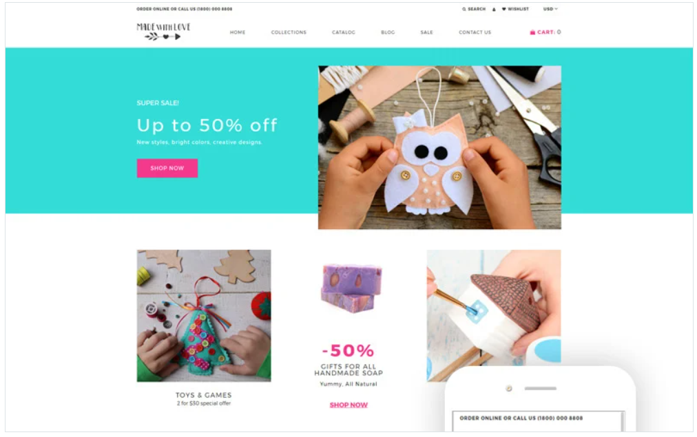 Made with Love - Hobbies & Crafts Creative Shopify Theme Shopify Theme is a great choice for developing elegant online store UI designs that help your business stand out from a crowd of thousands of similar platforms. This theme makes the process of creating, developing and managing an online store easy for everyone.