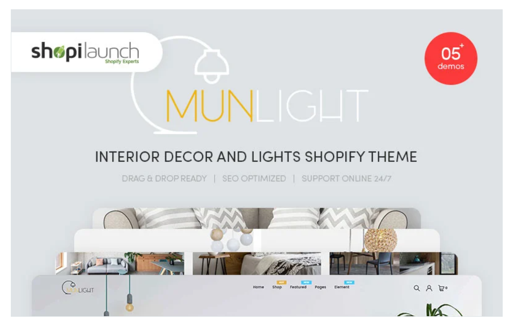 Munlight - Interior Decor and Lights Shopify Theme Shopify Theme is a great choice for developing elegant online store UI designs that help your business stand out from a crowd of thousands of similar platforms. This theme makes the process of creating, developing and managing an online store easy for everyone.