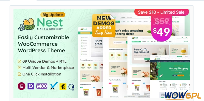 You can get Nest – Grocery Store WooCommerce WordPress Theme here on a huge discount on individual purchase, If you buy Wowgpl membership then You can free download Nest – Grocery Store WooCommerce WordPress Theme as well as You will get access to all the products (32790) free like WordPress, Woocommerce, Joomla, Drupal, Magento, Muse, Opencart, Prestashop, Shopify, Unbounce, Ghost, Tumblr, Virtuemart, Graphics, Html templates, Php script and more … free! We provide an automatic upgrade service for the wp plugin, We provide 24/7 hour support by Email, Live chat, Whatsapp, Skype as well as Phone Call support.