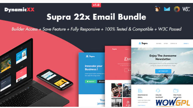Supra - Pack of Template is a compact, top of the line Email template that offers you the structure on which the rest of your website stands. It is a lightweight piece of code that makes things easier for you when setting up your own website.