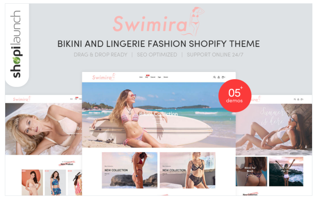 Swimira - Bikini & Lingerie Fashion Shopify Theme Shopify Theme is a great choice for developing elegant online store UI designs that help your business stand out from a crowd of thousands of similar platforms. This theme makes the process of creating, developing and managing an online store easy for everyone.