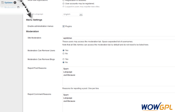 Configure a massive range of messages and options including which users you want to be moderators, whether they can remove users or blogs, different reasons for reporting different styles of content and notes that can be sent to users.